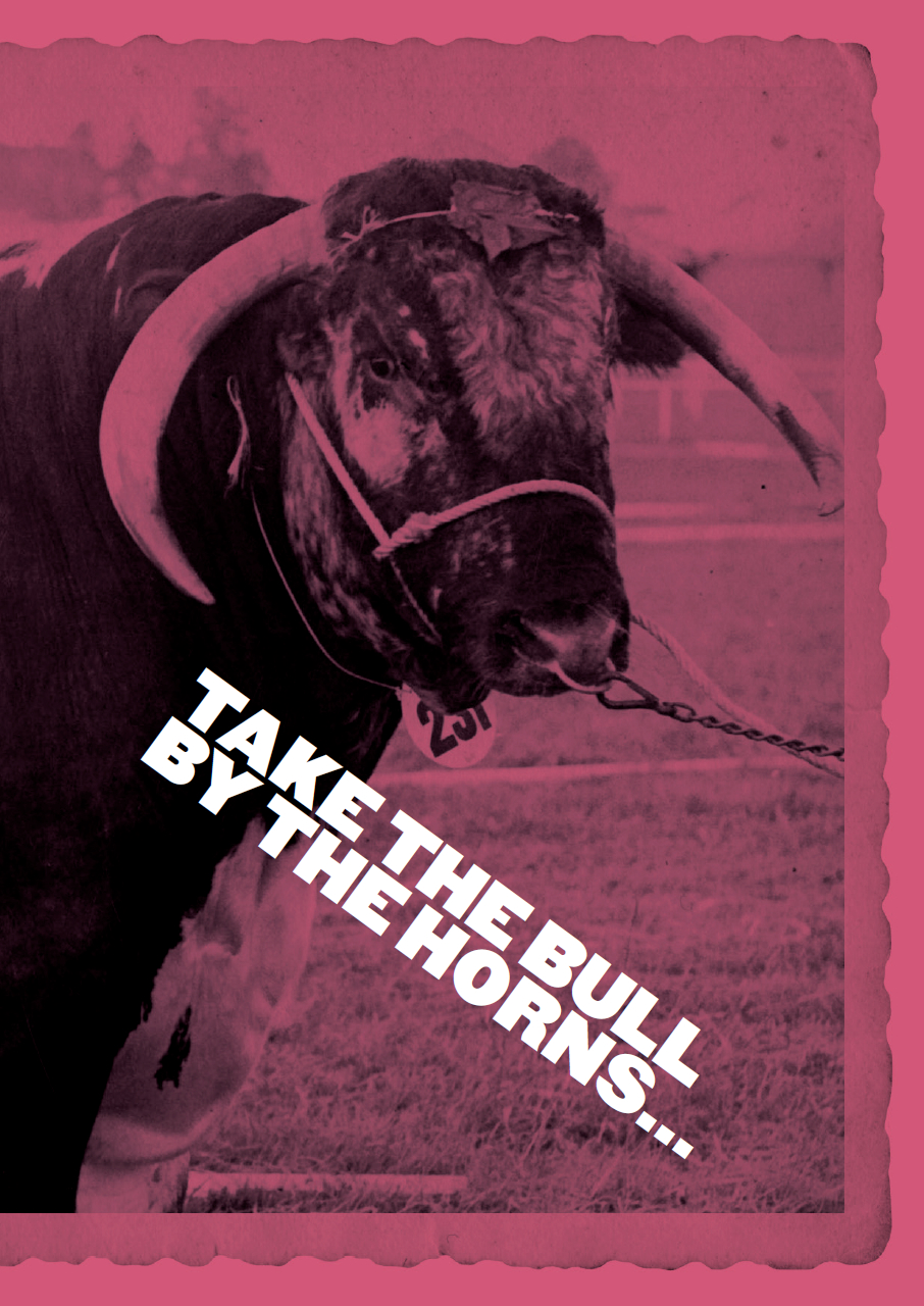 An historic image of a bull with the slogan "Take the bull by the horns"